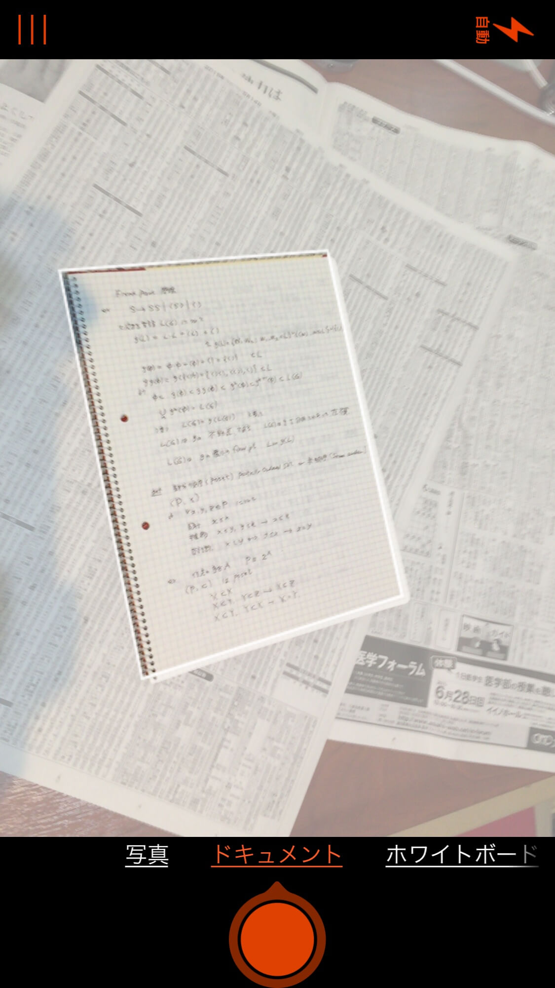 右図は、新聞の上に置いたノートの輪郭を自動的検出した様子である。 その後に撮影すれば、台形補正してくれる。