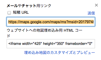 こうして作成したマイマップを特定個人と共有するにはその地図のURLを取得して、メールなどで知らせればよい。