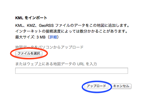 - [ファイル選択]ボタンを押してあらかじめ作成しておいたKML[ファイルを選択]する(赤で囲った)。