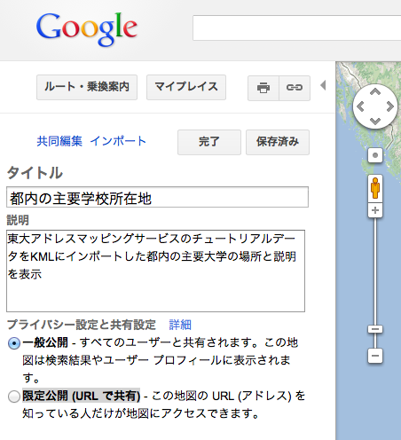 - [タイトル]ウィンドウに例えば「都内の主要学校所在地」、[説明]ウィンドウに例えば「東大アドレスマッピングサービスのチュートリアルデータをKMLにインポートした都内の主要大学の場所と説明を表示」を記入。 備忘録やこれを共有する人への説明となるので必ず詳しい説明を記入する。)