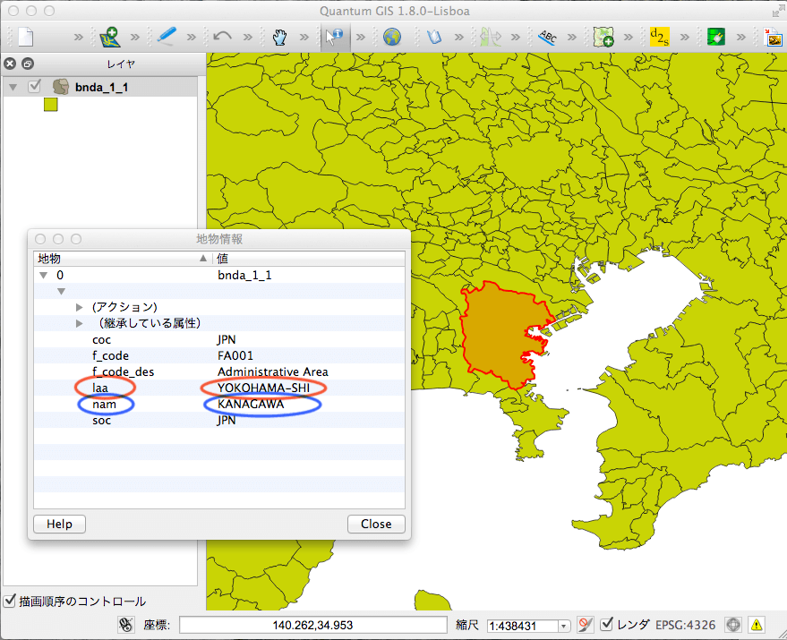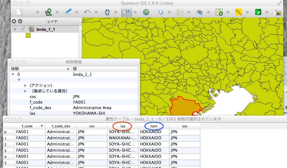 すると下図のように、bnda_1_1.shp属性は、LAA属性(赤で囲んだ)のラベル値「市町村名」、NAM属性(青で囲んだ)のラベル値「市町村名」以外にもf_code, d_code_des, coc, socがあることがわかるはずだ。 これらの属性の名前それ自体はデータ作成者が自由に決めることもできる。 また、「市町村名」や「市町村名」などのラベル値に日本語を使うこともできる(あとで、そのような例をみる)