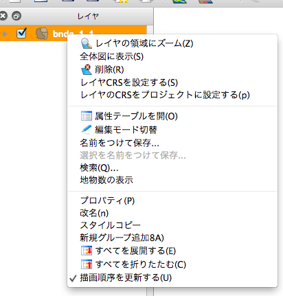 Shapeデータの持つ属性を知るには、レイヤパネルから読み込んだデータを選択して右クリックし、右図のように現れるサブメニュー「属性テーブルを開く」を開くと、データの持つ『属性』情報と各属性に付与されたラベル値の一覧を見ることができる。