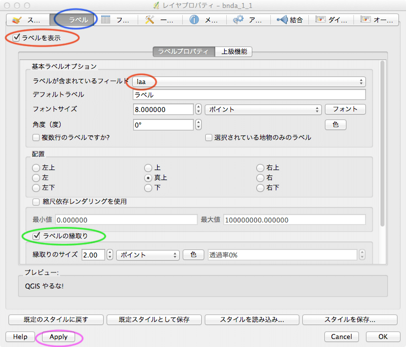 ここで、ラベルタブを選び(青で囲んだ)、「□ラベルを表示」をチェックし(赤で囲んだ)、ラベルプロパティで「ラベルが含まれているフィールド」から「laa」(赤で囲んだ)の属性を選択する。 ここでは、さらに見やすいように、「□ラベルの縁取り」をチェックして文字の背景と縁取りを加えている。これをon/offの効果を自分で確認するように。