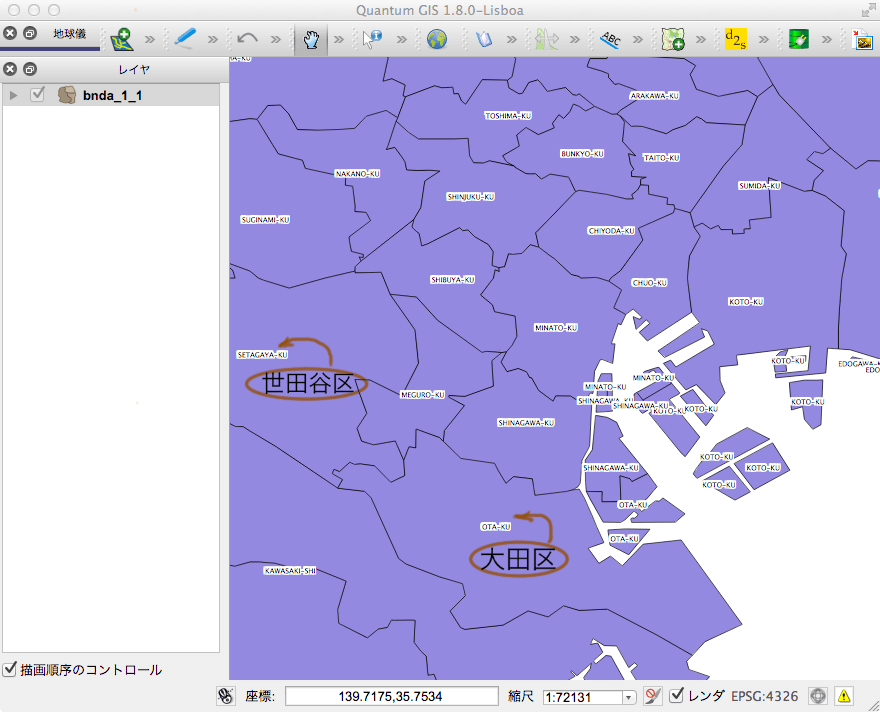 最後に、下にある「Apply」ボタンを押すと下のように、ポリゴンに指定した属性の文字列(ここでのデータではローマ字)が書き込まれる(念のために、世田谷区と大田区を漢字で指し示しておいた)。