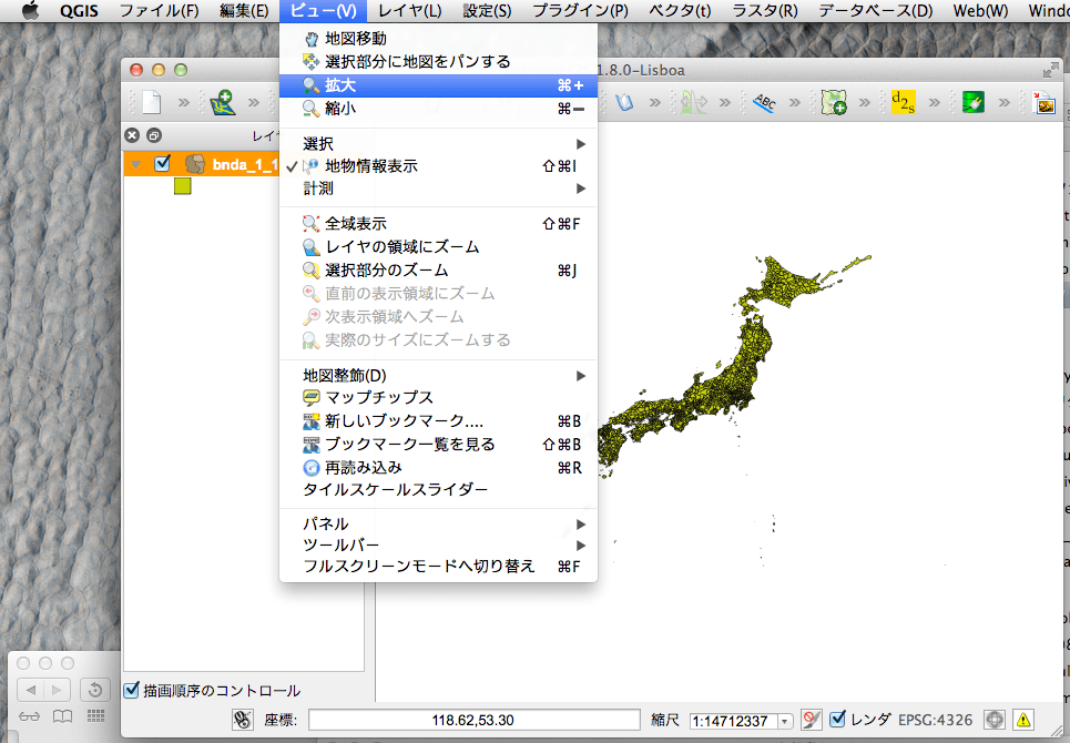 QGISのレイヤパネルにbnda_1_1.shpファイルをdrap& dropすると、日本全図が『全体図』パネルに表示される(GQISにレイヤパネルがないときには、上の図のように、[ビュー(V)menu]のサブメニュー下方にある『パネル』から「レイヤ」をチェックする)。