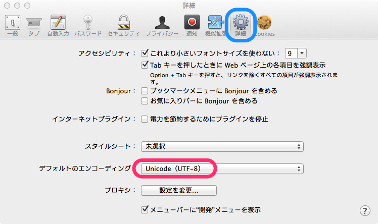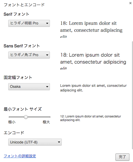 - Ver.35以降:[設定]/[詳細設定]/[ウェブコンテンツ]/[フォントをカスタマイズ]にある「エンコード」から選択(その様子表示する)。 あるいは 、フォント、言語、エンコードを変更する参照。