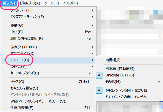 - メニューの[表示]/[エンコード]から選択(その様子を表示する)。