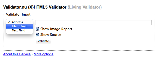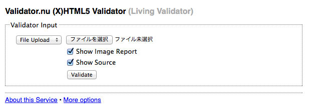 Webサーバ側に置く前にローカルパソコンに保存したHTMLファイルを検証するためにはFile Uploadを選んで、目的ファイルを選択する(クリックで拡大)。