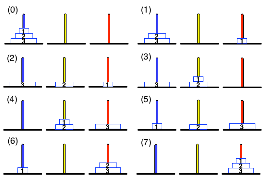 左図は $n = 3$ 枚の円板が元柱にあるとき、ルールを破らないように、手順 (1), (2), (3), (4), (5), (6) によって、ゴールである (7) に至る7回の円板移動の様子を示している。 これ以上少ない手順で円板を元柱から目的柱に移動させることはできない(本当?)
