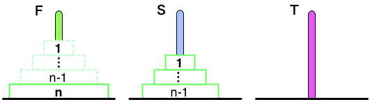 \[ \mathrm{Hanoi}(n, F, S, T) \]理解の鍵は、左図のような移動(上の図(0)→(3)に相当)する手順である。 つまり、柱 F にある上から $n-1$ 枚の円板を、柱 T を使いながら、柱 S に移動させる手順 $\mathrm{Hanoi}(n-1, F, T, S)$ が分かればよい。