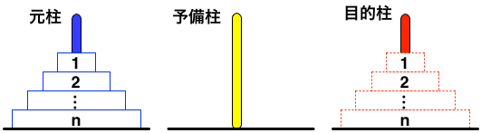 3本の柱([元柱], [予備柱], [目的柱])があって、大きさの違う $n$ 枚の円板が右図のように順に[元柱]に積んである。