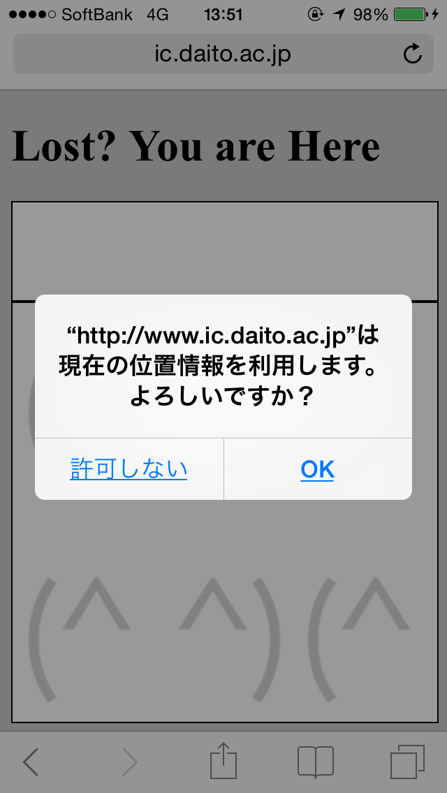 目的ページにアクセスすると、右図(iPhoneの場合)のようにページアクセスする機器の位置情報を利用する旨のメッセージが表示され、[OK]を押して許可を与えると、機器の現在位置が緯度・経度情報と共にGoogle Map上にピンが立てられて表示される。