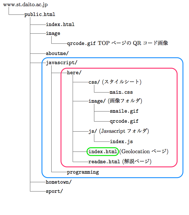 /javascript/here/index.htmlこのURLのQRコードを qrcode.gif としてフォルダ here/image 内に置く。 \vspace{1cm} フォルダ javascript二は'WebブラウザでじっこうされるJavascriptプログラミングを置く予定