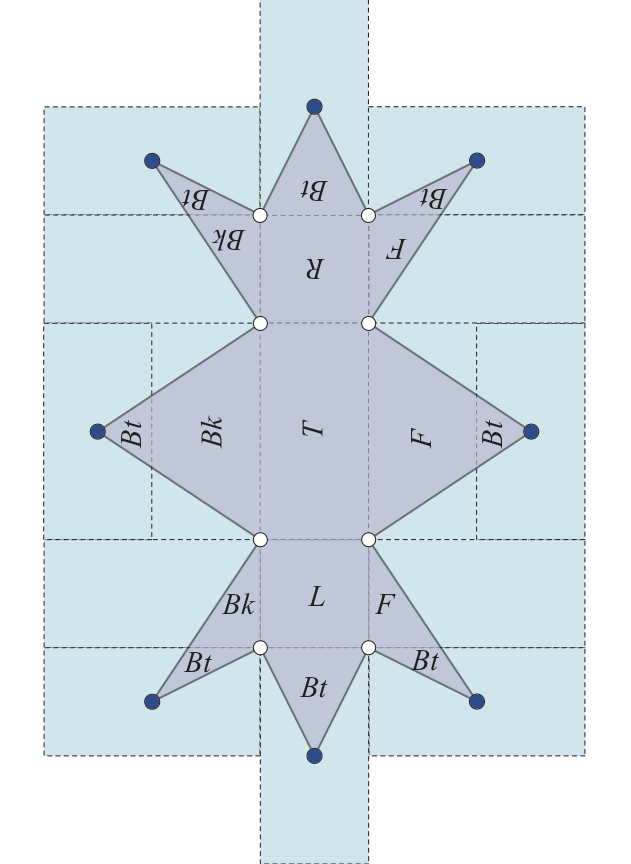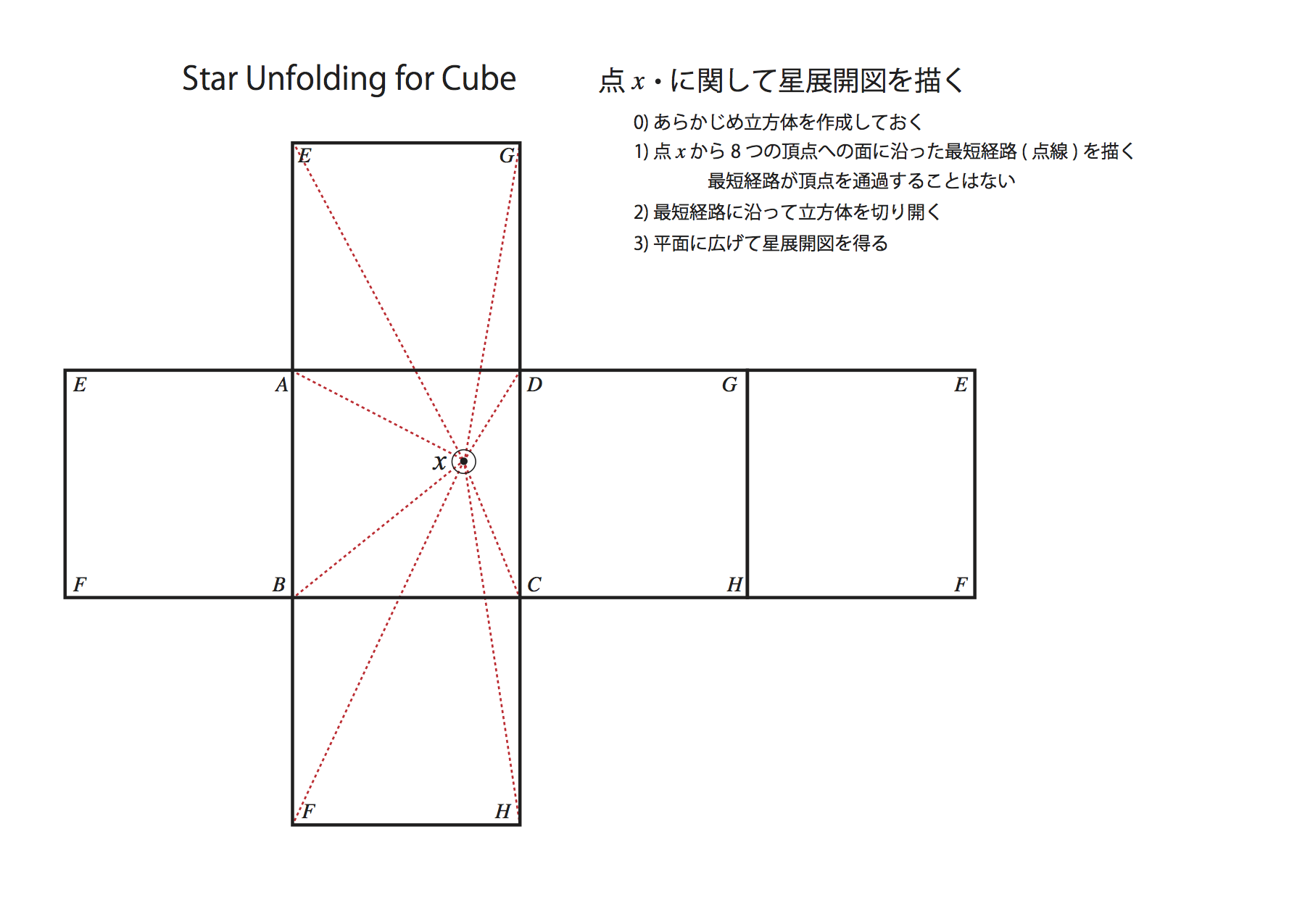 星展開の方法とは、凸多面体上の点$x$から全ての頂点への最短経路(shortest path)に沿って多面体を切り開くやり方である。 ただし、多面体上の点$x$を各頂点への最短経路が一意的に定まるように選ばれている必要がある。