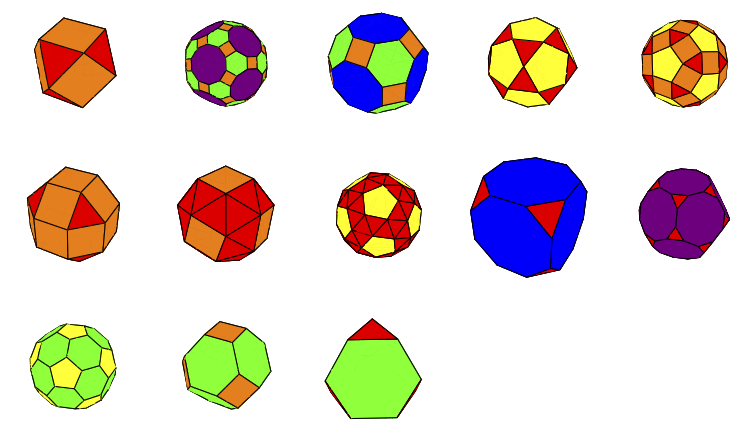 正多面体をプラトン多面体という。 全ての面が正多角形で、頂点に集まる正多角形の種類と順序が同じ(頂点形状が合同)であるような一様多面体でプラトン多面体以外の13種類の多面体を アルキメデス多面体(Archimedean solid)と呼ぶ。