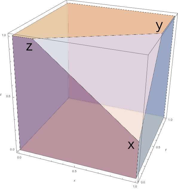 左図のように、辺の長さ1の正六面体の一部を、3点$x=(1, 0, 1/3)$, $y=(1, 1/2, 1)$, $z=(1/6, 0, 1)$を通る平面で切り取って得られた多面体を考える。