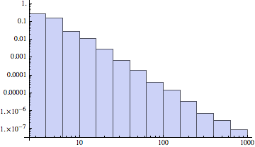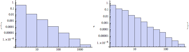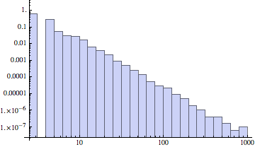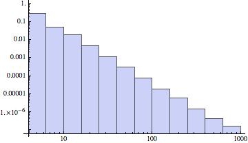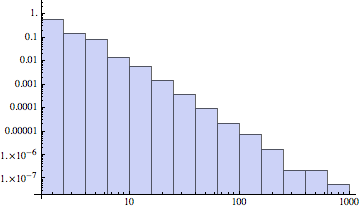 Histogram[VertexDegree[RandomGraph[baInternet]], {"Log", 10}, {"Log", "PDF"}]}