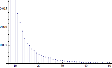 ここであがかれたデータ PDF[empddistrBA3, k] の先頭の10要素は次のようである。