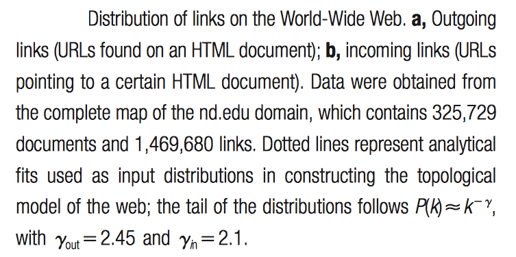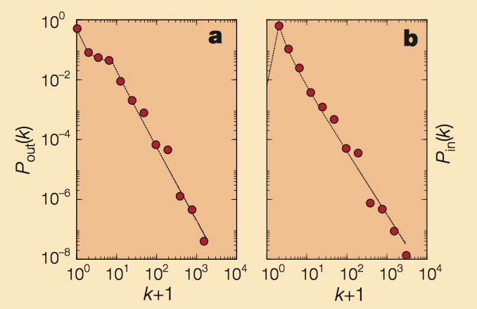 Albert-László BarabásiとRéka Albertは、Diameter of the world wide web(Nature 401, 130-131 (1999))でWebページの外向きリンクと内向きリンクの双方に関するネットワーク構造の次数分布がベキ法則にしたがっていることを発見した(左図)。 右図は左図の説明で、頂点 $k$ を持つ次数分布 $P(k)\sim k^{-\gamma}$ として、$\gamma_{out}=2.45$, $\gamma_{in}=2.1$と評価している。