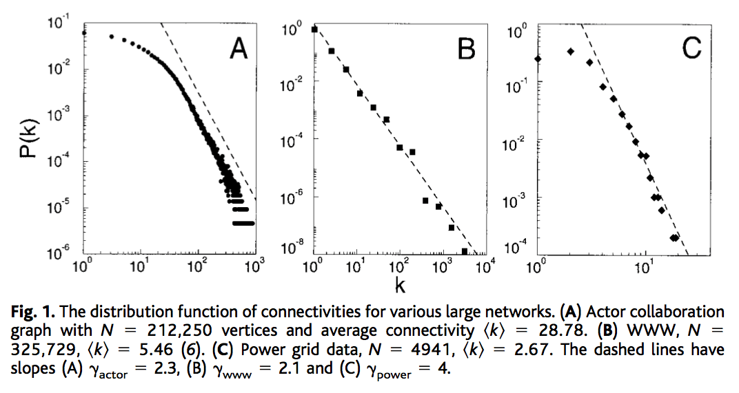 この論文では、左図のように、次数分布がベキ法則 $P(k)\sim k^{-\gamma}$ にしたがうようなネットワークとして、俳優の共演ネットワーク($\gamma_{actor}=2.3$)、Webページ($\gamma_{www}=2.1$)、電力グリッド($\gamma_{power}=4$)を挙げている。