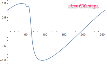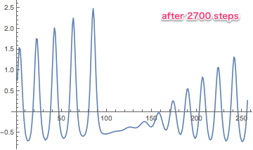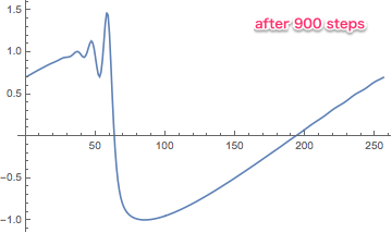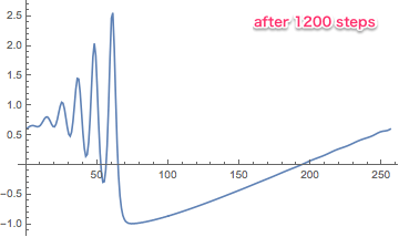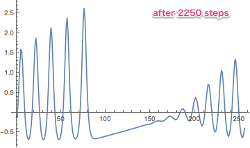 以下の図(クリックで拡大)は、単純な表示としてある瞬間における波ショットとして、ファイルに書き出した各行の$N$個(この例では256個)の波高データの幾つかをそれぞれ取り出してを、MathematicaのListPlot(Joined->True オプションを付けて線で結んだ)でプロットしたものである。 600ステップくらいから、ソリトンに成長する立ち上がりが発生し、900ステップには2,3個のソリトンが現れる様子が分かる。 1200ステップになるとソリトン列となって進行していく様子(周期境界条件によって $x=0$ は $x=2$ とはつながっていると見なして観察する)。
