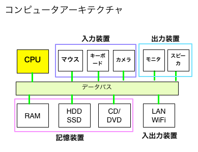 左図は、CPUを1つの部品として含むコンピュータアーキテクチャを説明する図だ。 CPU計算やプログラムロードなど計算に利用するデータを格納しておくための記憶装置(メモリ)、コンピュータにデータを入力するための入力装置およびCPUで処理されたデータを出力する出力装置からコンピュータは構成されている。 ディスク装置やネットワーク装置のようにデータの入出力(I/O: Input Output)に関わるデバイスも少なくない。