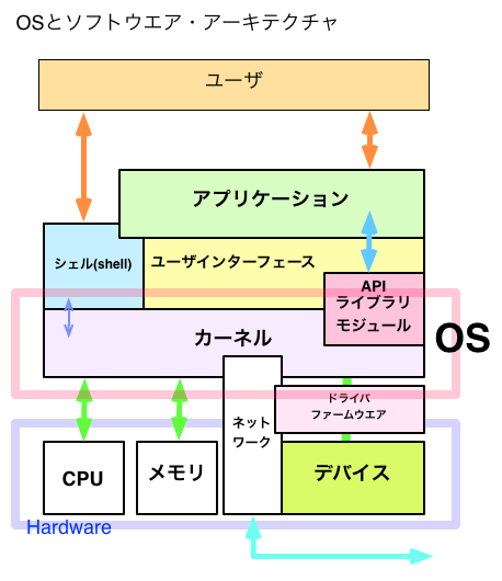 ハードウエアを直接覆うソフトウエア層をカーネル(kernel:核)またはOS(Operating System:基礎本ソフト)と呼んでいる。