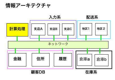 各支店(Web店舗も含む)から購入要求があった物品を顧客に配送するための情報システムを例にしている。