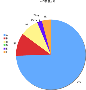 - "人口"シートで求めた人口密度の値を、[密度範囲, 密度ランク, 密度]の表で定義したランク Aから F でラベルする。