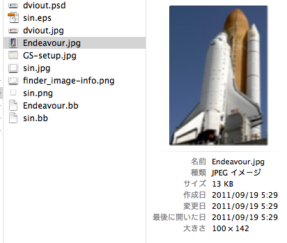 じっさい、右図(MacOSのFinderの表示)では 画像ファイル Endeavour.jpg は 100 x 142 ピクセルのJPG形式であることを示しているので