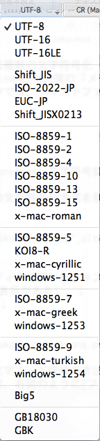MacOSのエディタ mi では、このように、文字コード指定のメニューアイコンから目的の文字符号化を選択(下図右)してから、保存する。