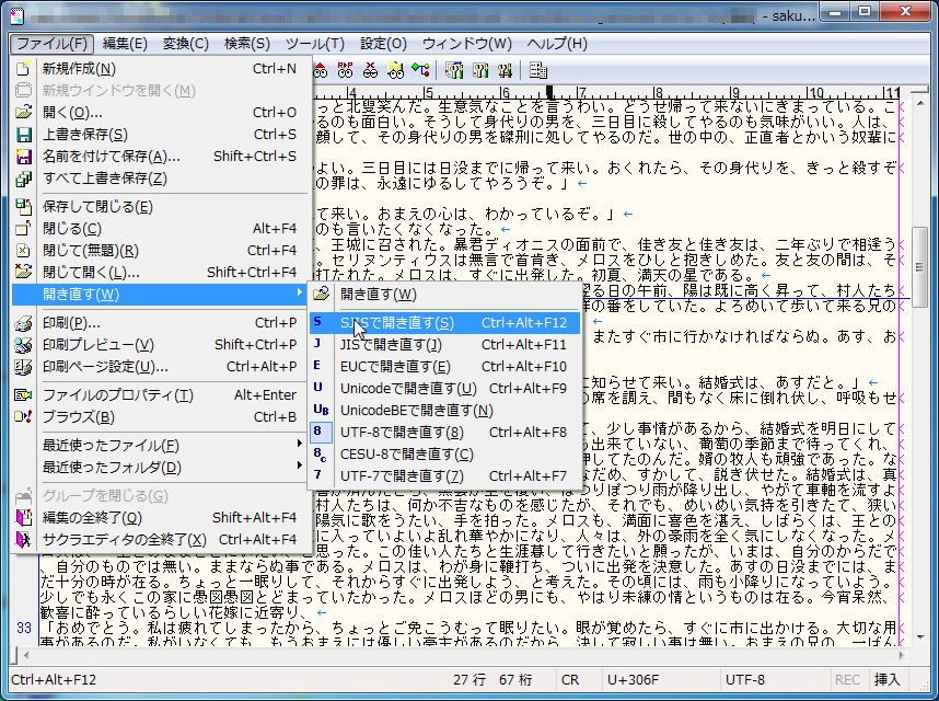 Windowsのエディタ サクラエディタ では、下図左(クリックして拡大)のように、[ファイル]/[開き直す]から目的の文字符号化を選択してから保存する。