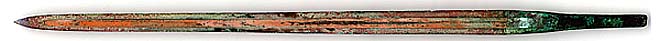 | 総長36.5cm、刃長30cm、面幅0.8〜1.4cm 突き刺すことを目的とした武器の一種である。本来は四菱形と言われているが、本品は三菱形である。 一応錆を落として研いであるが、各面中央の血道に朱が塗られている所から考えるに、恐らく明器とし て副葬されていたものであろう。問題は名称である。一応カン(金+間)としたが、カンは鞭の一種との 説も有り、形態から槍(細長すぎる)とか錐(太すぎる)とかの意見も有るが、詳細は不明である。博雅の 士の指教を切に請う所以である。 |