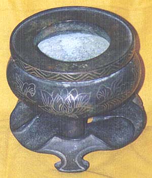 面白い。銀糸で蓮花の象嵌が施してあり、台座も蓮葉を