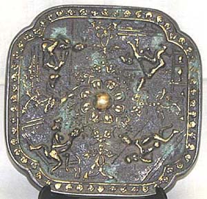 全体的形態と中央・縁の花紋様は唐の葵花形を模 しているが、春宮図は主に清朝あたりから作られる もので、唐代には無い。また、唐代は白銅が、清朝 は黄銅が中心で、青銅ものは概して少ない。本品は 一見青銅の様に見せて居るが、それは表面を加工 している為で、実は中身は真鍮であり、塗金の如く 見えるのも、単なる着色に過ぎず、青錆びも人工的 に付けたもので、複数の時代の特徴を各々模して合 わせた、極めていかがわしい倣品である。 |