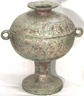 倣戦國青銅鑲嵌蟠獸文有耳有蓋豆(現代、AD1990〜2010)・荒牧氏寄贈