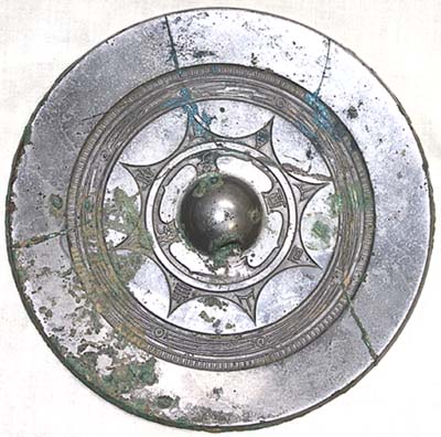 直径16.3cm、縁厚0.5cm、厚さ0.4cm 後漢時代の大型鏡で、四葉文紐傍に「長宜子孫」(左回り)、その外 側に「壽如金石」(右回り)の銘文が刻され、その外側が圏線文で、 更に幅広の無文縁となっている。この様な形態の鏡は、後漢初期か ら山東・河南・陝西地方を中心に、多く出土している。 尚、本品は、数枚に割れたものを繋ぎ合わせた補修品である。 平成24年度ゼミ卒業生寄贈品。 |