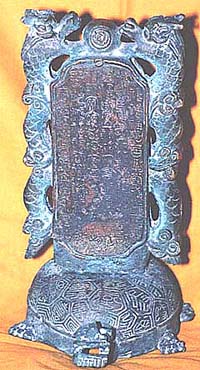 | 高さ17cm、幅8.5cm、厚み14.5cm 臘付けではなく全体が型抜きになっている点、及び内 部に多量に残っていた鋳造時の砂土質・鋳造の荒さ 等から、一応清朝末期の鋳造と判断したが、使用目 的が不明である。恐らく、道教の観宮等で長壽を祈る 道具(一種のお供え物)として、使用されたものではな いのかと推測される。牌の正面には異なる書体の「福」 字が陽刻篆文で多数鋳込まれ、背面には同じく篆文の 「福蔭壽載」が陰刻で鋳込まれている。外面の錆を落 として磨いた所、部分的ではあるが、本来の黄銅の黄 金色が現れた。 |