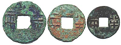 | 左・・八銖半兩錢、径3.1cm、中・・六銖半兩錢、径2.6cm 右・・四銖半兩錢、径2.3cm 半兩錢は秦代から有るが、これは前漢初期(呂后から文帝・景帝期 にかけて)のものである。文献(『史記』平準書・『漢書』食貨志)に因 れば、半兩錢は、八銖・六銖・四銖・楡莢の四種類が存在した事にな っている。秦から漢への移行期に鋳造された半兩錢で、四銖半兩錢 から所謂漢の五銖錢へと統一されて行く。 |