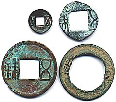 | 上段左・・小五銖錢、径1.1cm 上段右・・磨郭五銖錢、径1.8cm 下段左・・五銖錢(背上有星文)、径2.5cm 下段右・・延環五銖錢、径2.6cm 後漢の五銖錢は、光武帝の建武十六(40)年 から鋳造され出すが、前漢に比べてやや薄く 且つ軽く、「五」の文字が前漢の直線的な様に 比べてより曲線的である。ほぼ200年間に渉 る後漢時代は、この五銖錢が一般的に流布す るが、末期の獻帝初平元(190)年には、董卓 が小銭を鋳造している。 |