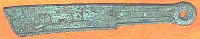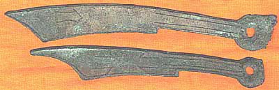 | 上段長さ・・15cm、中段長さ・・13cm、下段長さ・・12cm 上段・中断は共に尖首(齊)刀錢の贋物で、上段の刀錢には六 とおぼしき字が、下段の刀錢には、行とおぼしき字が鋳られて いるが、明らかに本来の文字と異なる。亦下段は円首(趙)刀錢 の贋物で、「甘井」の二字(本来の甘は口の中の横棒が無い甘 字)が鋳られている。本品は、外見的形態はほぼ同じ(長さがや や短く、文字形態が異なる)でも、意識的に古色を付けた現代 の倣青銅刀錢である。尚、現代の倣品は、本歌に比べて全体 的に厚みが有り、逆に長さはやや短く、音も鈍い。特に尖首(齊 )刀錢に関しては環部分の中空が概して小さく、逆に円首(趙) 刀錢では中空部分が丸過ぎる。尚、本歌はNO、38・39・69を 参照の事。 |