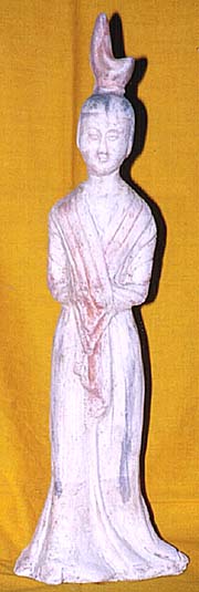 高さ37.5cm、幅11.6cm、奥行き8.4cm 唐初の婦人俑に似ているが、衣服の様 子や顔立ち等が、隋時代であることを表 している。隋の加彩俑は、北魏・北周の 流れを汲み、堅く焼いた灰陶に加彩し、 紋様の彫り込みも直線的で力強く、底板 も無い。婦人の顔立ちも細身であり、全 体に素朴さが感じられ、唐俑の如き大ら かさ・ふくよかさは見られない。ほぼ同形 態で35.5cmの品が、陝西省歴史博 物館に蔵されている。 |