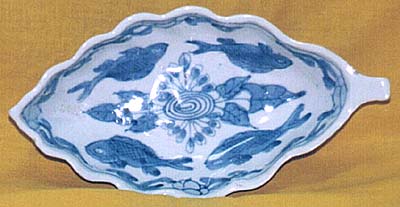 汕頭窯青花魚花文木葉形皿(清初期時代、AD1644〜1795)