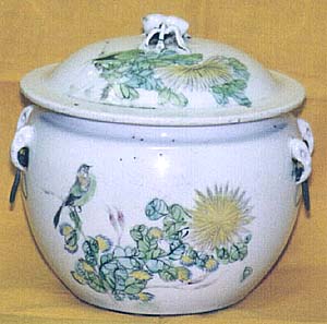 粉彩花鳥文有蓋象耳粥罐(民國初期時代、AD1912〜1922)