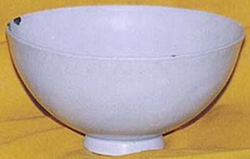 高さ10cm、口径20cm、底径6.8cm 内側は印花(型押文)の雙鶴紋と雲紋で、その間に「福禄」の二文字が配され、外側は刻花で 口縁部に渦巻き紋・足部分に蓮弁紋が描かれ、しっとりとした白色失透釉がかけてある。元朝 の枢密使の府で使用する官器として景徳鎭で作らせたと言われている、所謂元白磁の代表作 である「枢府手(枢府の二字や福禄の二字などを、碗内印花紋の間に配している)」白磁で、腰 のあたりの作りが厚く、やや開き気味の高台は無釉で内部は兜巾状を呈している。一般的に 枢府白磁の生産は1300年代14世紀に入ってからと言われている。本品は、惜しいことに口 縁部に三カ所の直しと五本の入が見られるとは雖も、元の「枢府手(福禄)」白磁の貴重なサン プルである。本品と同形態同紋様の鉢は北京の故宮博物院に所蔵されており、亦やや口開き 形態で同紋様の鉢が東京国立博物館に所蔵されている。尚、本品は市村氏の特段の御芳情 に因り、当研究室に御寄贈を賜った品である。 |