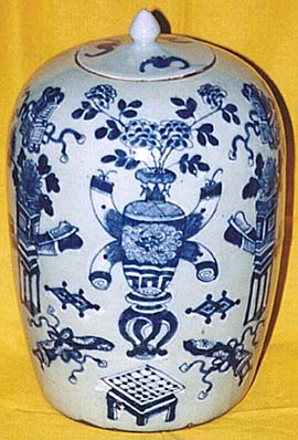 豆青釉青花古玩文有蓋罐(道光年間、AD1821〜1850)