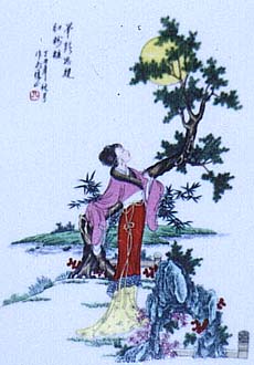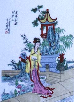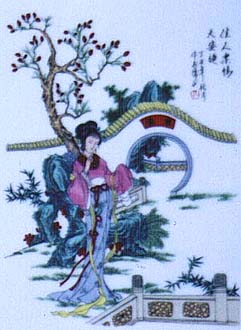 清朝風仕女図の陶板であり、印刷彩色である。三枚とも同一人物に因る絵付けである。