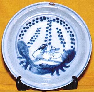 青花喜鵲登梅文深皿U(明末期時代、AD1621〜1661)