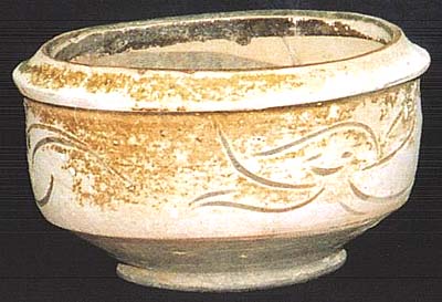 高さ6.6cm、口径10.2cm、底径5.8cm 黒灰色土を胎土として使用していれば、河北窯の系統であろう 。一見白地ものの様に見受けられるが、これは上薬の黄釉が 剥離したため、下の白化粧が出ているだけである。本来は、黒 灰色土の上に白化粧を施し、その上に黄釉をかけ刻花で紋様 を描いた黄釉もので、現在故宮博物館に所蔵されている「黄釉 刻花文筒罐」と同じ品であるが、本品は、その下手な品でしかも 発掘品のため、殆ど黄釉が剥離している。微かに汚れの様に 見える茶色の部分が、黄釉の名残りである。尚、赤色土を胎土 とした同形態の、遼寧省江官屯窯ものは、NO、351を参照。 |