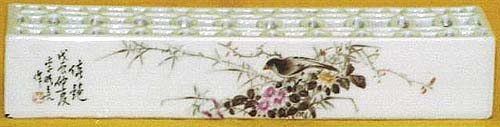 陶器で作られた紙鎮で、前後に花鳥紋様が描かれ、上部は亀銭紋の透かし